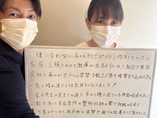体に合わない高さの机でパソコン作業をしていたら、首・肩・上腕にかけて激痛が走るようになり、初回が原因究明と、痛みが出にくい姿勢を教えて頂き、暗雲立ち込めた空が一気に晴れ渡ったような気持ちになりました!金子先生の見立ての通り、首から横に出ている神経の炎症があり、ご紹介頂いた首肩専門の整形外科の薬で神経の炎症を落ち着かせてから根本的な姿勢や凝りの改善をして頂きました。