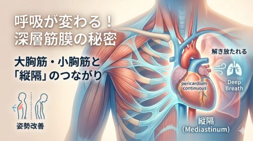 胸の表面にある「大胸筋」や、その奥にある「小胸筋」を包む膜は、ただ筋肉を包んでいるだけではありません。実は、鎖骨の裏を通り、首の深層を経て、心臓や気管が収まる胸の中央スペース**「縦隔(じゅうかく)」**へと地続きでつながっているのです。