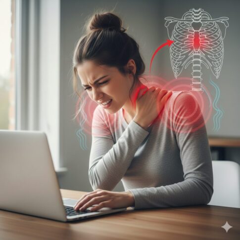 その答えは、痛みの出ている「背中」ではなく、その裏側にある**「胸郭(きょうかく)」の前面**に隠されています。今回は、解剖学的視点から大胸筋と「胸肋関節(きょうろくかんせつ)」の関連性を紐解き、なぜここが肩こり治療の最重要ポイントなのかを医学的根拠に基づいて解説します。