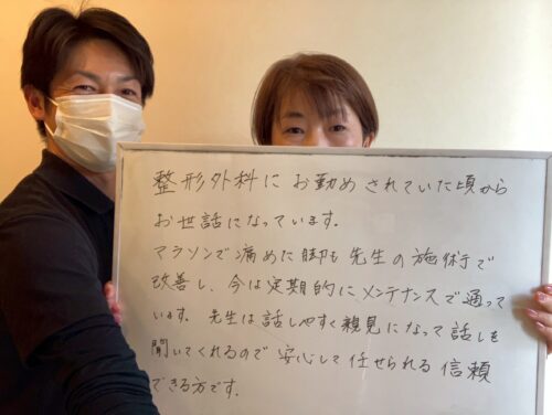 整形外科に勤めされていた頃からお世話になっています。マラソンで痛めた脚も先生の施術で改善し、今は定期的にメンテナンスで通っています。先生は話しやすくて親身になって話を聞いてくれるので、安心して任せられる信頼できる方です。