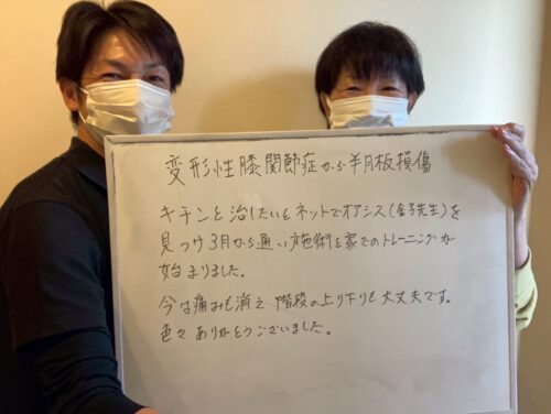 変形性膝関節症から半月板損傷、キチンと治したいとネットでオアシス(金子先生)を見つけ3月から通い、施術と家でのトレーニングが始まりました。今は痛みも消え階段の上り下りも大丈夫です。色々ありがとうございました。